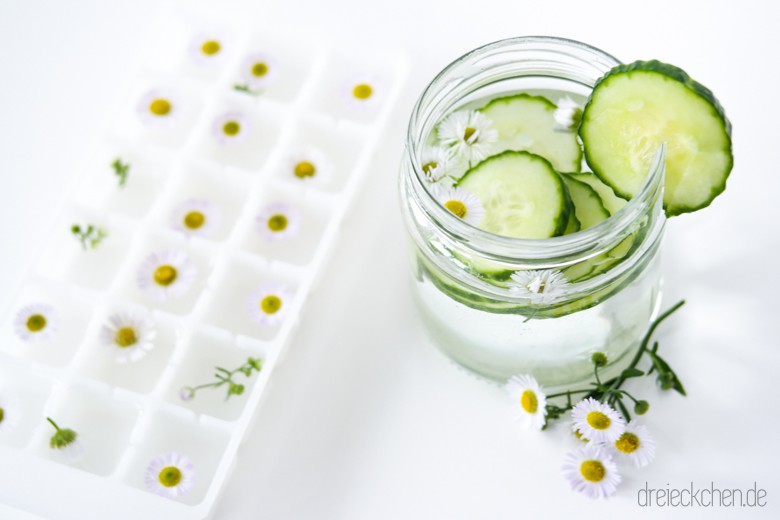 | 1 Gurke 1/2 Zitrone Mineralwasser Gänseblümchen |