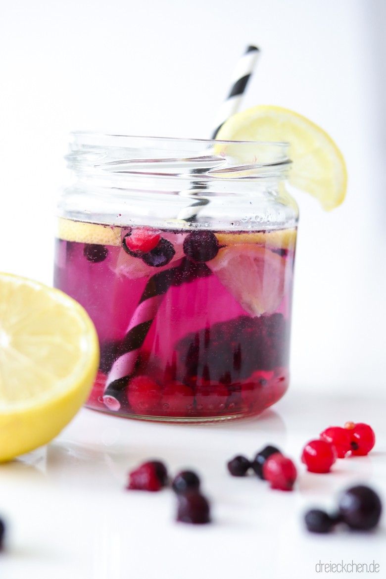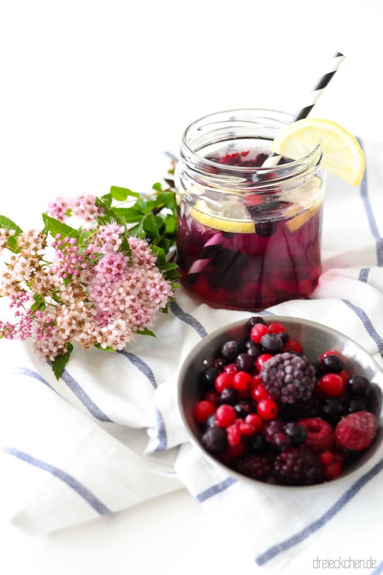 | Wasser (still oder sprudelnd) Beeren nach Wahl (Himbeeren, Erdbeeren, Brombeeren usw.) Halbe Zitrone |